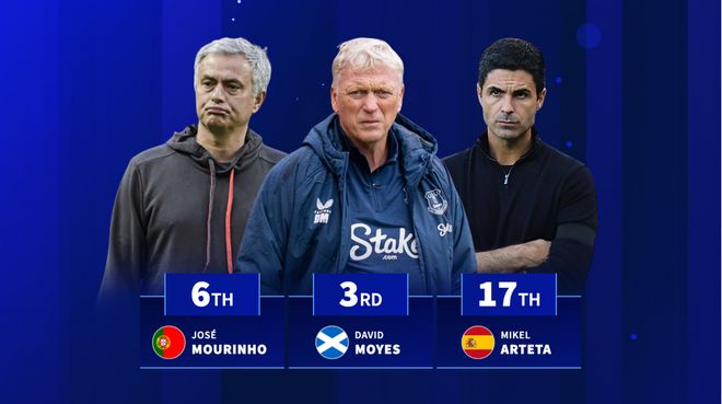 第三名是现任埃弗顿主帅莫耶斯,他带过749场英超比赛,拿下了1067分。