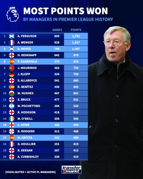 领跑的是传奇人物弗格森爵士。这位苏格兰老头带着曼联拿了13个英超冠军,执教了809场联赛,攒下了足足1752个积分,数字大得吓人。