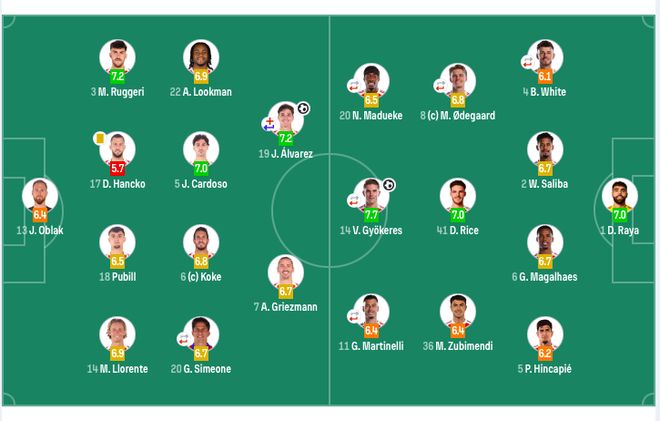 马竞首发:13-奥布拉克、14-马科斯·略伦特、17-汉茨科、18-普比尔、3-鲁杰里、5-卡尔多索(88’16-莫利纳)、6-科克、7-格列兹曼、20-朱利亚诺·西蒙尼(46’24-勒诺尔芒)、22-卢克曼、19-阿尔瓦雷斯(77’10-巴埃纳)。