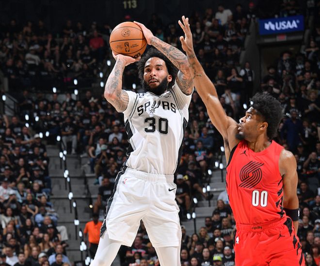 第三节比赛,阿夫迪亚上篮,卡斯尔2记三分+尚帕尼3罚2中,马刺领先26分,亨德森、卡马拉把分差追到21分,暂停回来格兰特三分,分差追到18分,哈珀三分+福克斯2罚1中,格兰特、罗威合砍4分,分差还是18分,瓦塞尔、福克斯把分差扩大到22分,格兰特、克雷伊奇合砍4分,文班独得5分,分差23分,赛布尔抢断上篮,三节战罢马刺86-65领先。